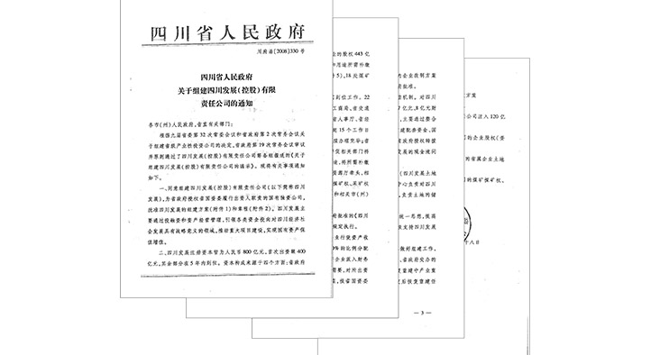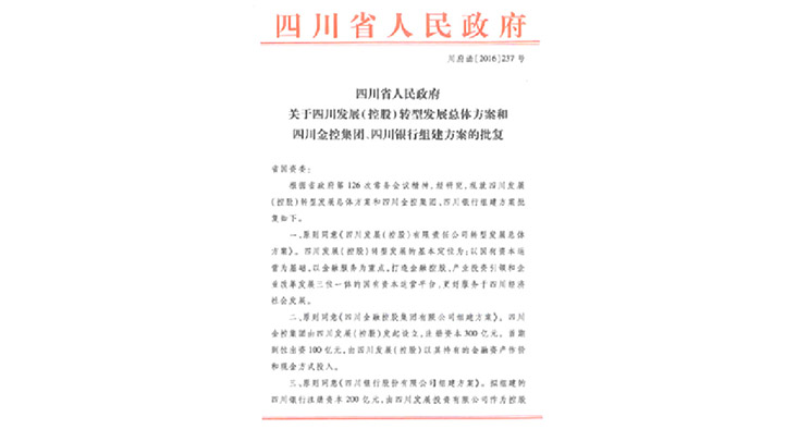 省政府下發(fā)《關(guān)于組建四川發(fā)展(控股)有限責(zé)任公司的通知》,同意組建四川發(fā)展(控股)有限責(zé)任公司。