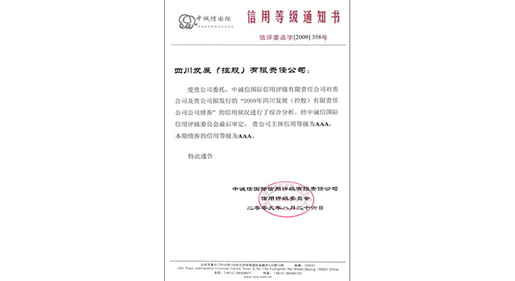 公司獲得中誠信國際信用評級公司高度認同,成為四川首家主體評級AAA級企業(yè)。